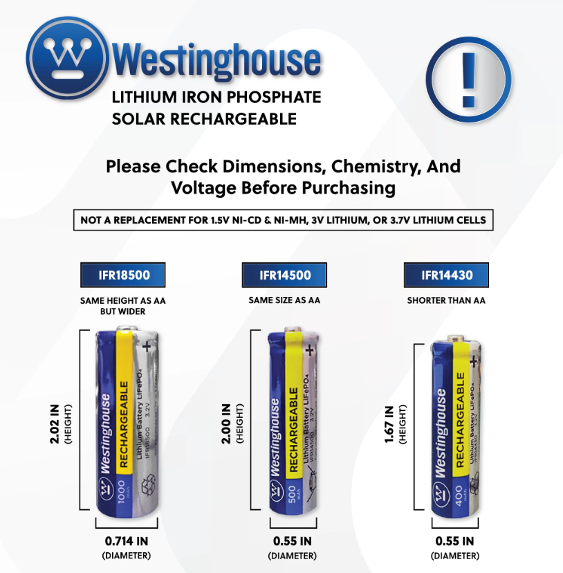 8 Pack Westinghouse Life-PO4 14500 3.2v 500mah Solar Rechargeable