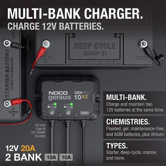 Noco GenPro 10x2 On-Board Battery Charger 2-Bank 20-Amp -Smart Battery Maintainer and Charger